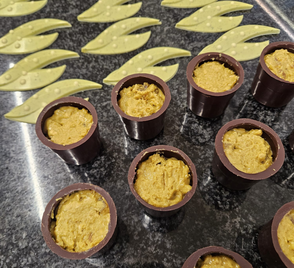 - Le pot gourmand, en chocolat noir et lait, cache un cœur généreux: un praliné pistache croustillant marié à des éclats fondants de pâte de fruit à l’abricot.